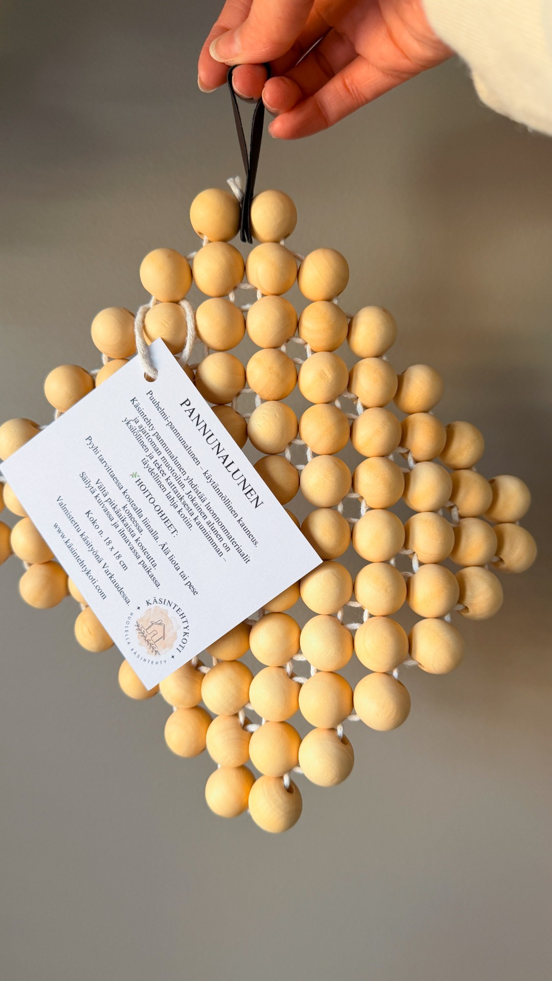 Käsintehtykodin pannunalunen on suunniteltu suojaamaan pöytäpintoja kuumuudelta – samalla tuoden kotiin pehmeää, luonnonläheistä ilmettä. Puun sävyiset helmet ja ajaton muotoilu tekevät siitä sekä käytännöllisen että kauniin osan kattauksia.